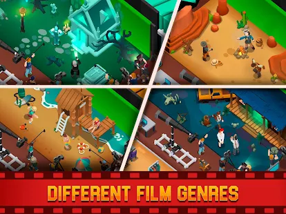 Choose from different genres (action, drama, adventure, comedy, romance, suspense, horror…) and select the main theme (western, spy, ghost, vacation, military, superheroes…) to be successful with your productions. Update your movie sets for more props and use them wisely to amaze movie critics!