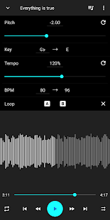 Music Speed ​​Changer allows you to change the speed of the audio files on your device in real time without affecting the pitch (time span), or change the pitch without changing the speed (pitch shift). Alternatively, both speed and pitch can be adjusted together with a single control. The app is also a music looper – you can slow down the song and looped sections of the music for easy practice. Another feature is the ability to reverse audio (play music backwards).